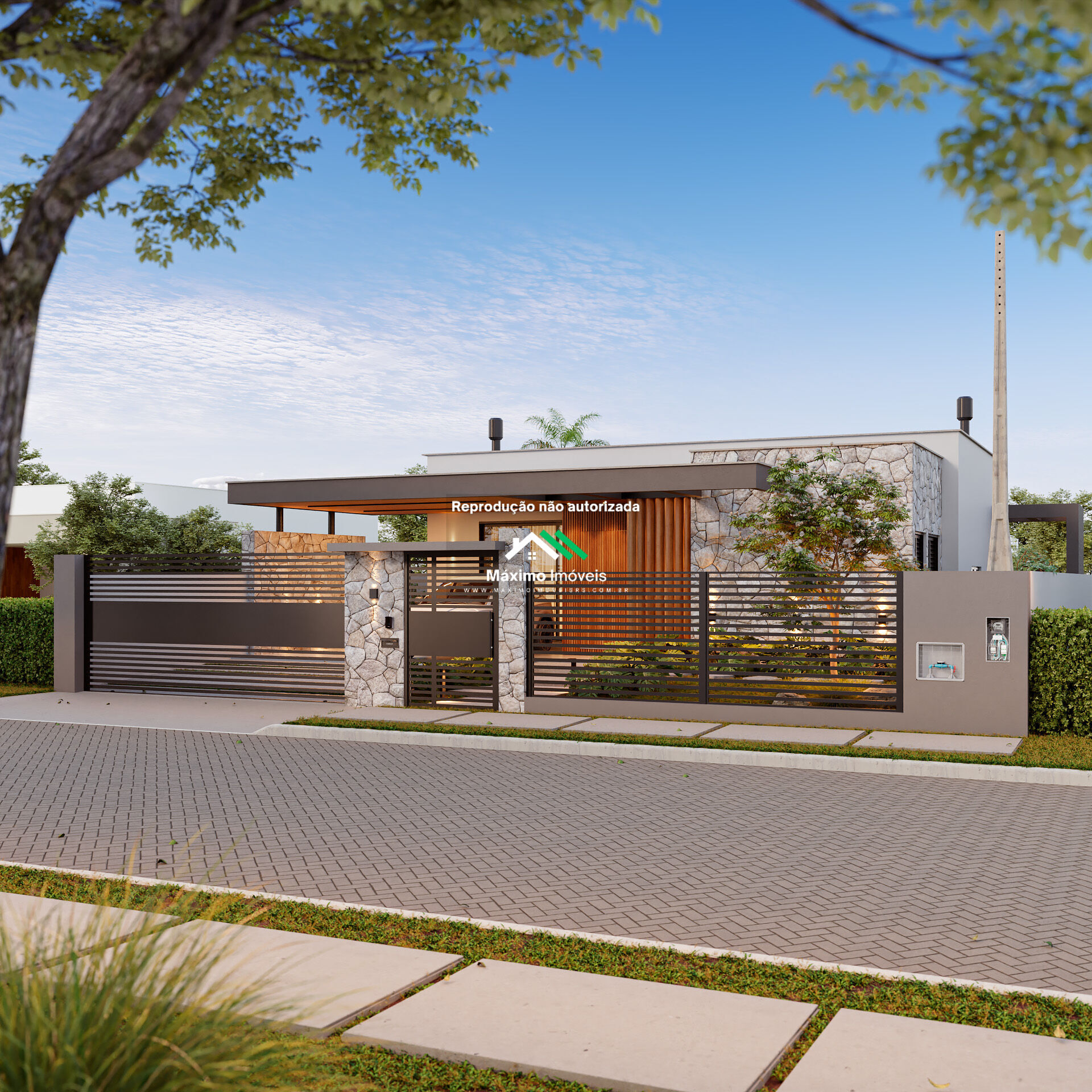 - Muros com gradil metálico e portão elétrico de correr