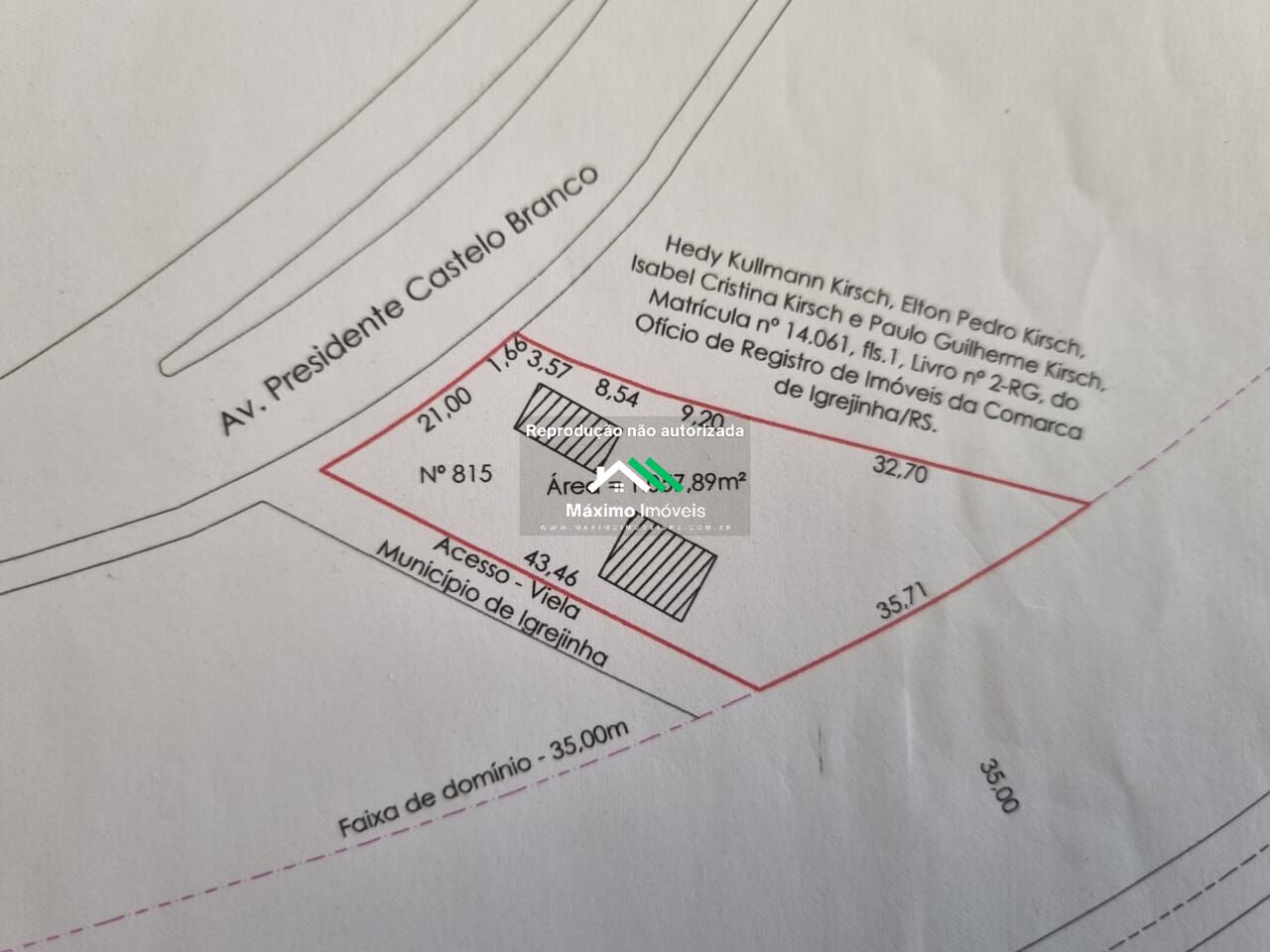 Excelente oportunidade de investimento! Terreno com área total de 1057.89m² disponível para compra na Avenida Presidente Castelo Branco, bairro Centro em Igrejinha-RS, uma das últimas opções de terrenos grandes do centro da cidade. Localizado em uma região privilegiada, este terreno está próximo de diversas facilidades como banco, escola, farmácia, hospital, igreja, padaria, praça, supermercado e transporte público.